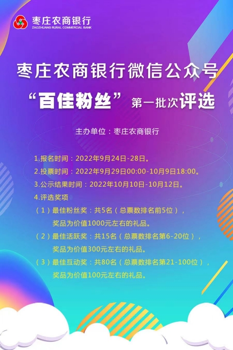 棗莊農(nóng)商銀行微信公眾號“百佳粉絲”評選活動開始報名啦!