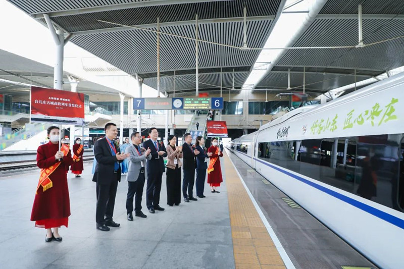4月27日上午,由臺(tái)兒莊古城冠名的高鐵列車(chē)首發(fā)儀式在濟(jì)南西站隆重舉行。首發(fā)儀式上,車(chē)身標(biāo)有“好客山東 匠心棗莊”的高鐵列車(chē)正式亮相。